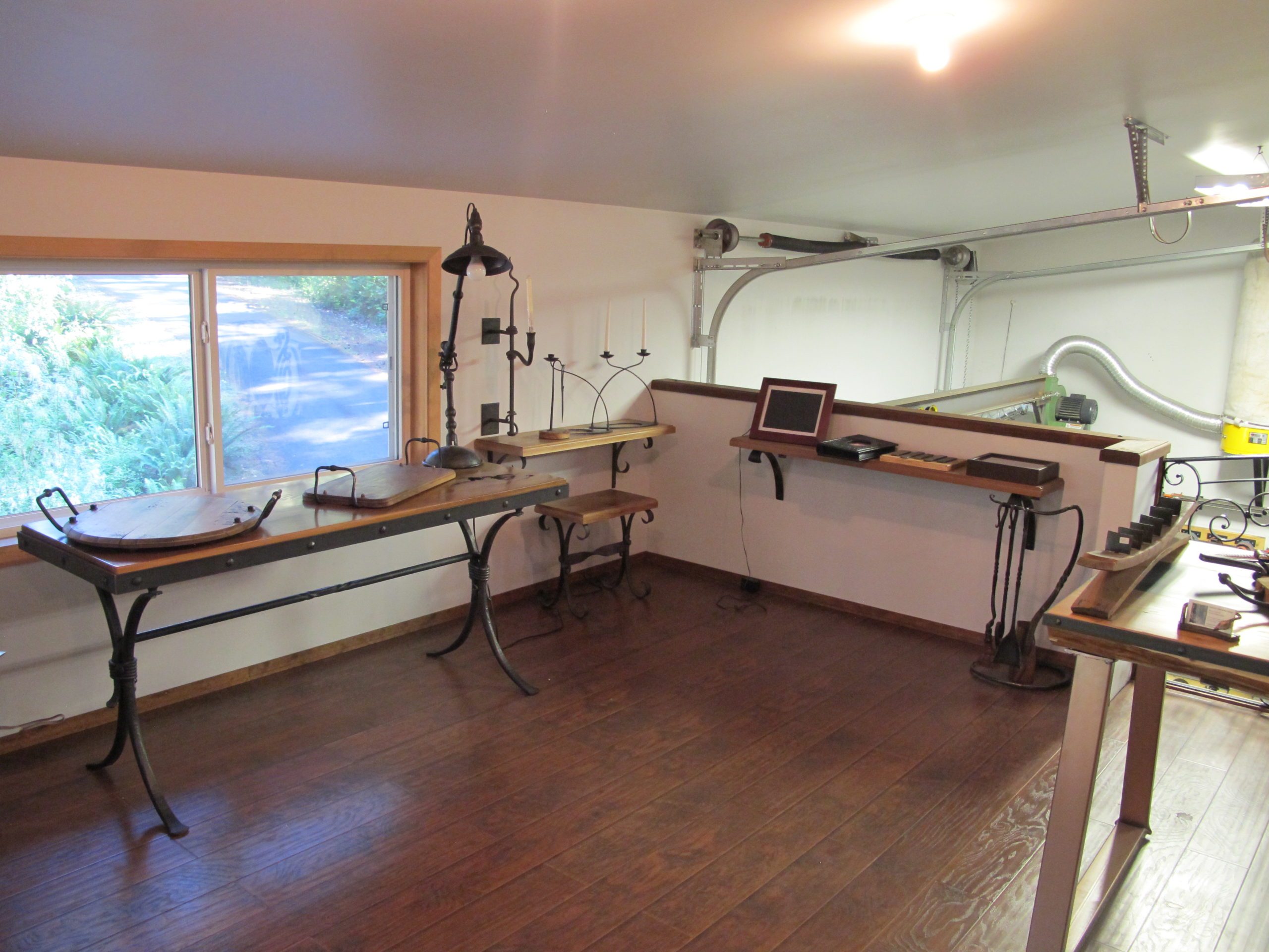 The showroom of stewart mountain forge has pieces for sale on display and examples of the works that are done in the forge.